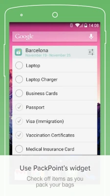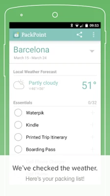 PackPoint kelionės pakavimo sąrašas – „Google Play" redaktorių pasirinkimo apdovanojimo laureatas. Tai kelionių planavimo programa, kuri padeda rimtiems keliautojams suorganizuoti daiktus į lagaminą. Sudarykite sąrašus pagal kelionės trukmę, orus ir numatytas veiklas. Nieko nepamirškite! Sąrašus galite išsaugoti ir dalytis su artimaisiais.